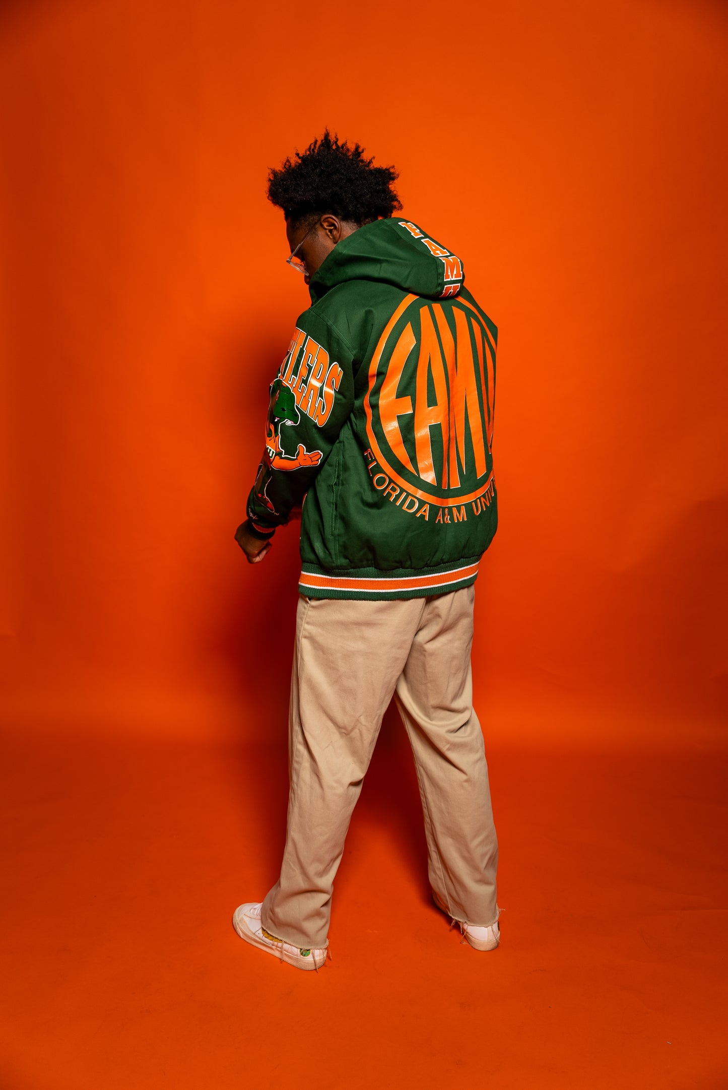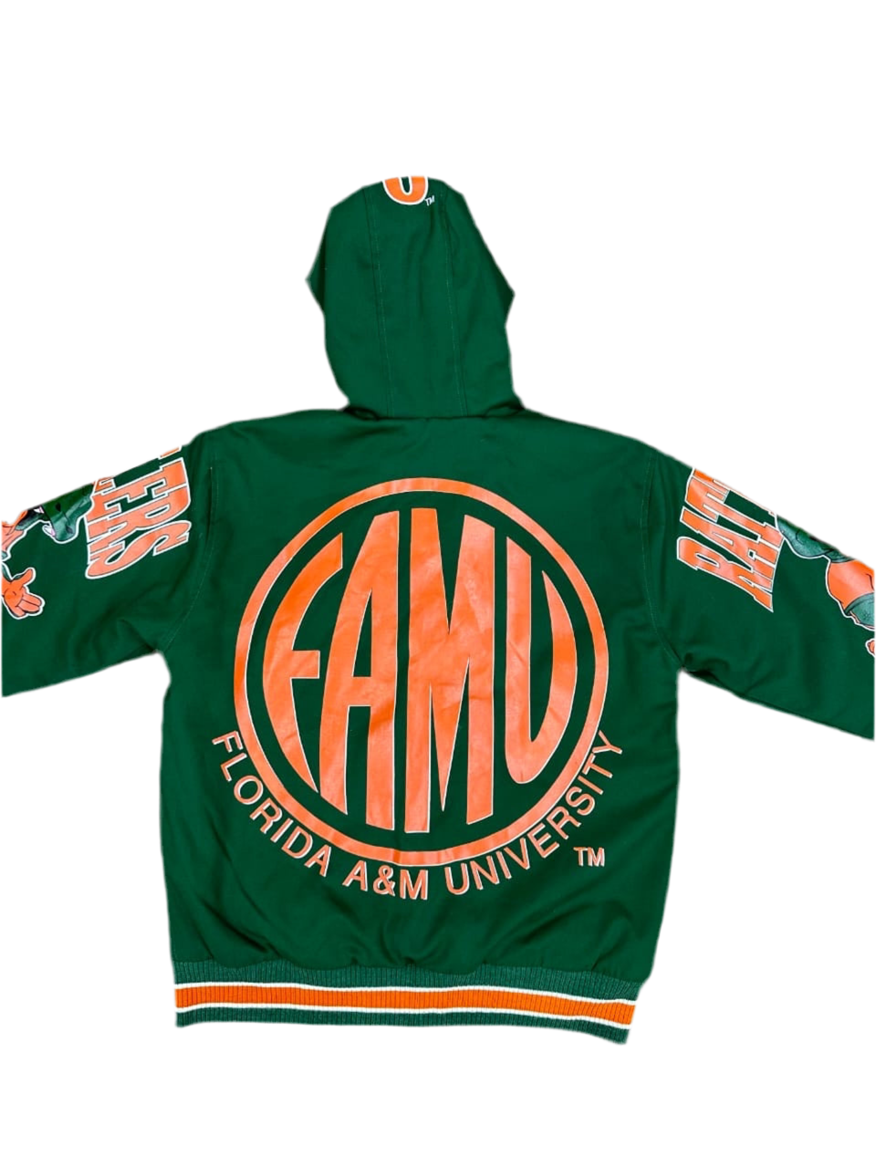 Get ready to rep Rattler Nation in style with the officially licensed FAMU Venom Hooded Work Jacket! Designed for both durability and comfort, this heavyweight canvas jacket features a satin-lined interior, keeping you warm and looking sharp. The full-color screen-printed graphics on the chest, back, sleeves, and hood celebrate Florida A&M’s iconic spirit. Practical and stylish, it includes dual inner zippered breast pockets, slit front pockets, a YKK front zipper closure, ribbed cuffs, and a waistband for the perfect fit.